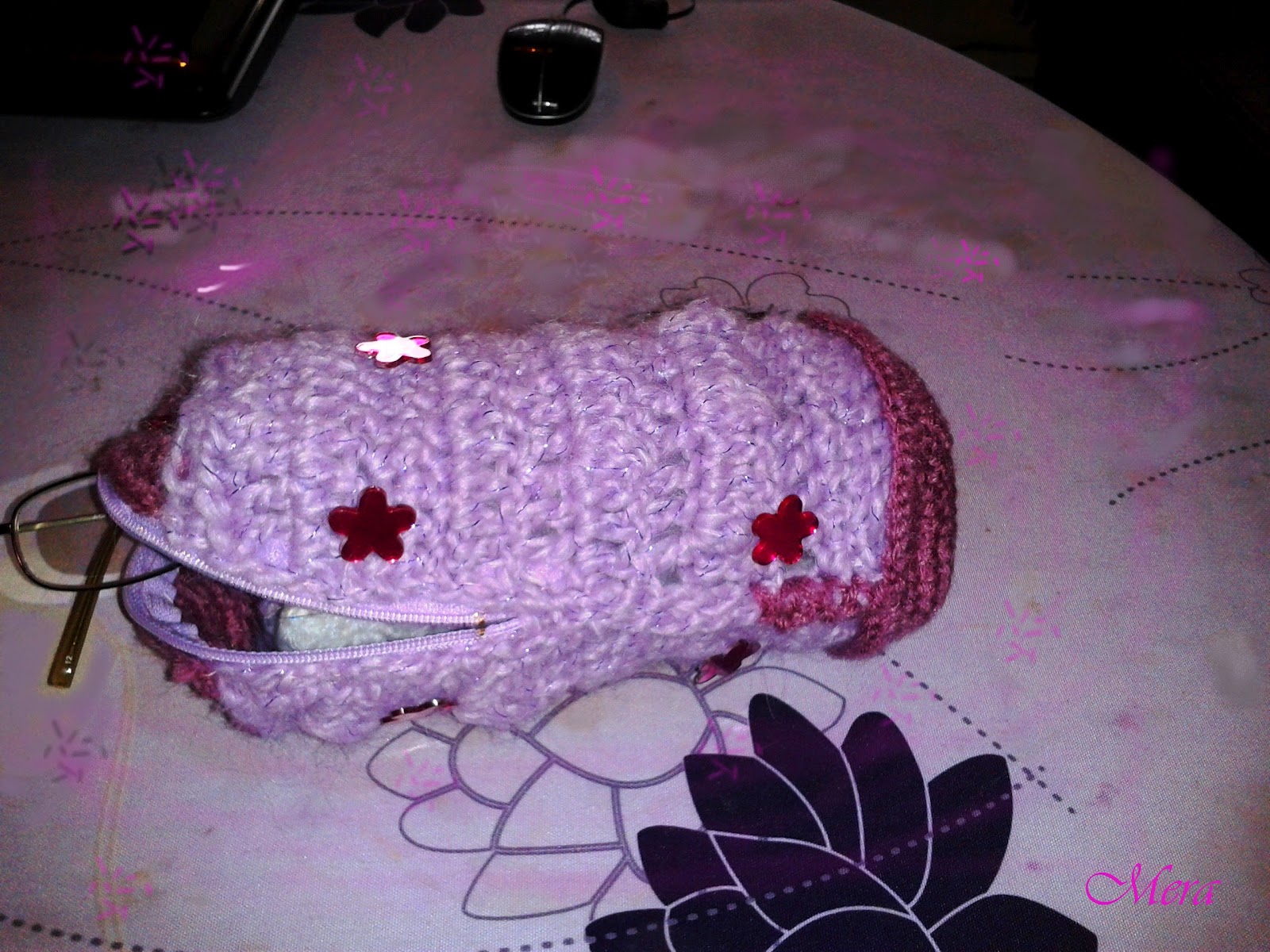 Donc, cogitation, cogitation.... après un certain temps une idée à émerger : faire un boitier pour mes lunettes de soleil, tiens ! Alors, crocheter les divers éléments, ça va. Les assembler aussi. Au fait, ça se coud comment une fermeture-éclair ???? Bon, j'ai trouvé une explication, et, et j'ai réussi !!! Pour une première, je m'en tire pas trop mal !